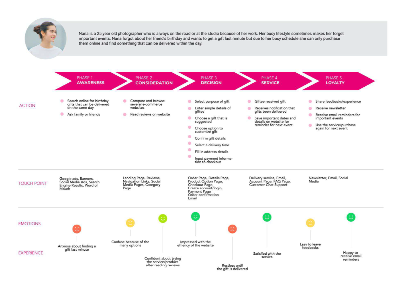 The goal for this project is to create a website design for an online gift store. First, a customer journey map was done. The website prototype was build on Figma.