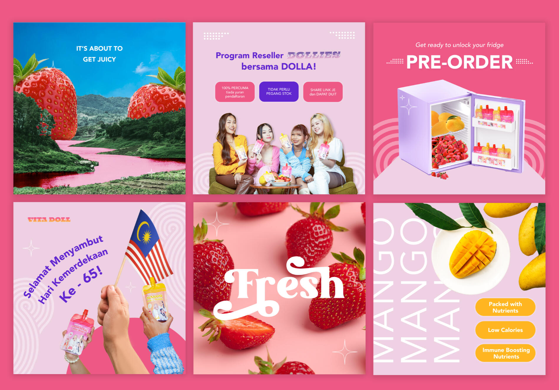 Vita Doll is a fruit beverage by DOLLA, a collaboration project between AVANA and Universal Music Group Malaysia. Working on the creatives, my goal was to showcase the fun energy DOLLA carries with them. We leveraged lively color palettes, that fits DOLLA brand image as well as the fruit drink.