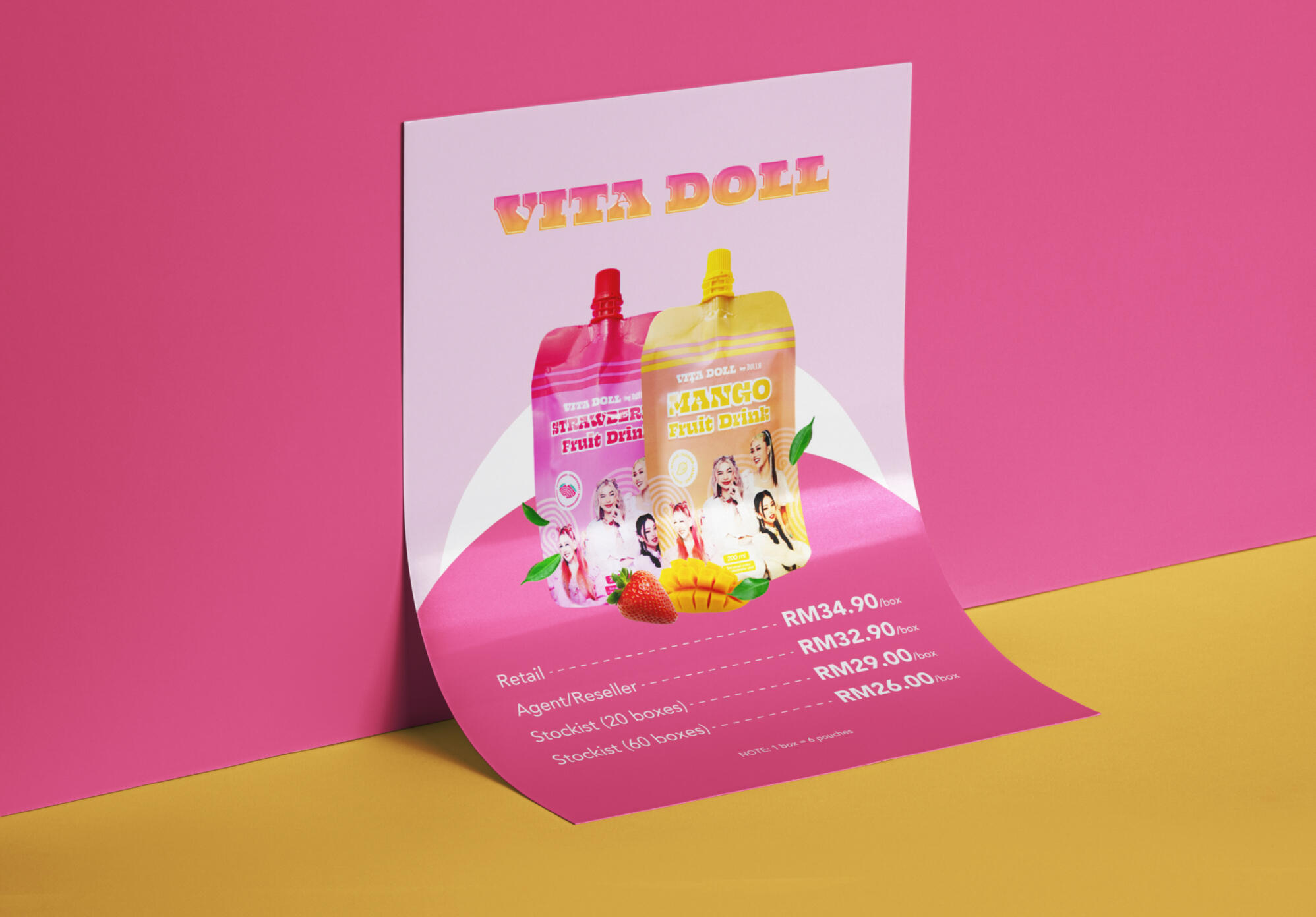 Vita Doll is a fruit beverage by DOLLA, a collaboration project between AVANA and Universal Music Group Malaysia. Working on the creatives, my goal was to showcase the fun energy DOLLA carries with them. We leveraged lively color palettes, that fits DOLLA brand image as well as the fruit drink.